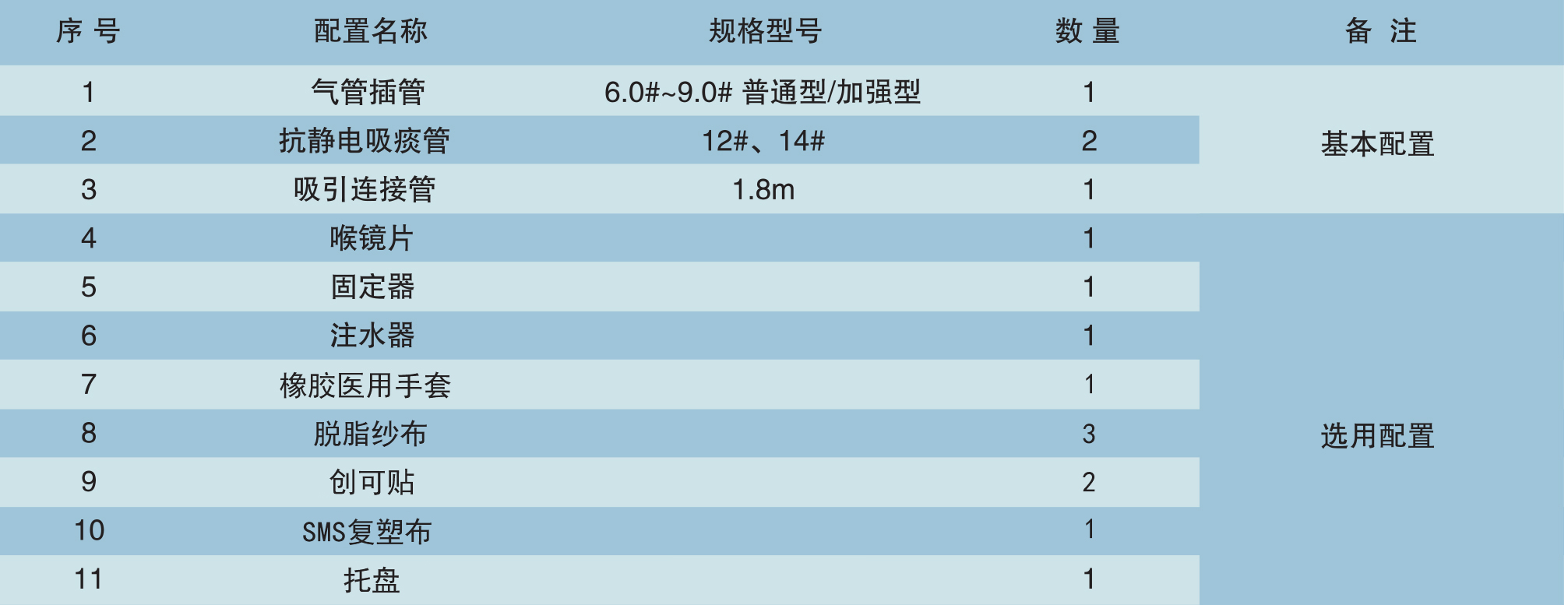 配置優質氣管插管,12#、 14# 抗(kàng)靜電吸痰管。配置高品質的吸引連接管及喉鏡片,減少(shǎo)術中(zhōng)感染及交叉感染。
